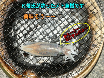 早速登場のカッパさんに修理したてのタモを作っといてもらう なんと! タモを準備してすぐに アオリが掛かったーの声! 見ればk畑氏のメト竿が大きく曲がっている! なんとも実にタイミングの良い展開ではないですか、